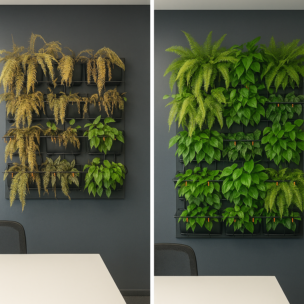 Recentemente, fui chamada para recuperar um jardim vertical instalado em um escritório corporativo em São Paulo. O espaço, muito bonito visualmente, apresentava um painel com samambaias, peperômias e jiboias — todas espécies bem escolhidas para ambientes internos.