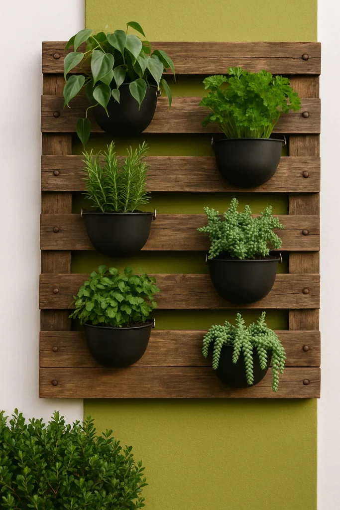 • Com módulos internos: encaixe pequenos módulos para jardim vertical dentro do palete, criando um visual modular e organizado.